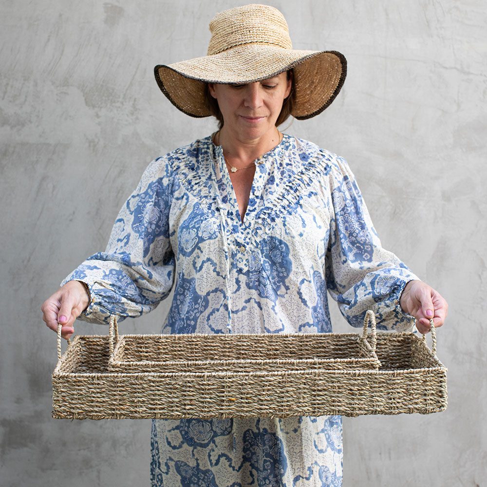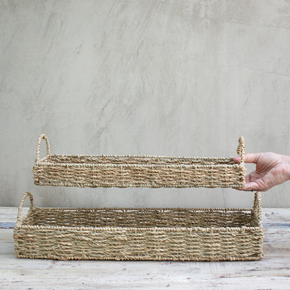 Bandeja rectangular y alargada tejida a mano en seagrass natural, con asas trenzadas en los extremos. Liviana, firme y muy decorativa: suma textura cálida y orden a mesa, cocina o entrada—ideal para el look simple y boho.