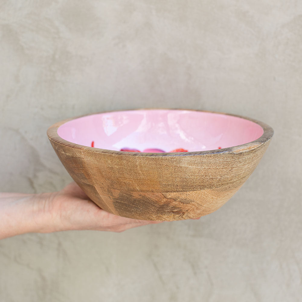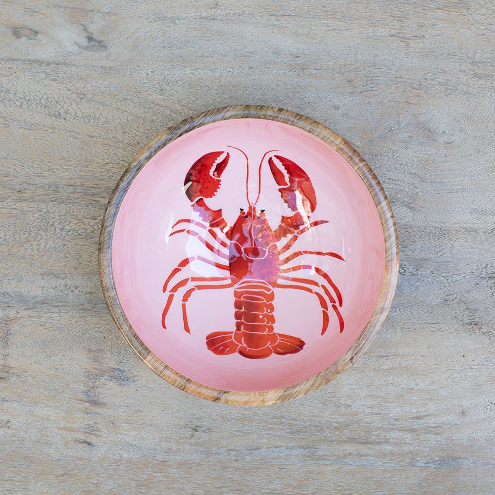 Este bowl artesanal de madera de mango natural destaca por su interior en tonos rosados con una langosta roja ilustrada, perfecta para quienes disfrutan de la estética veraniega y costera.