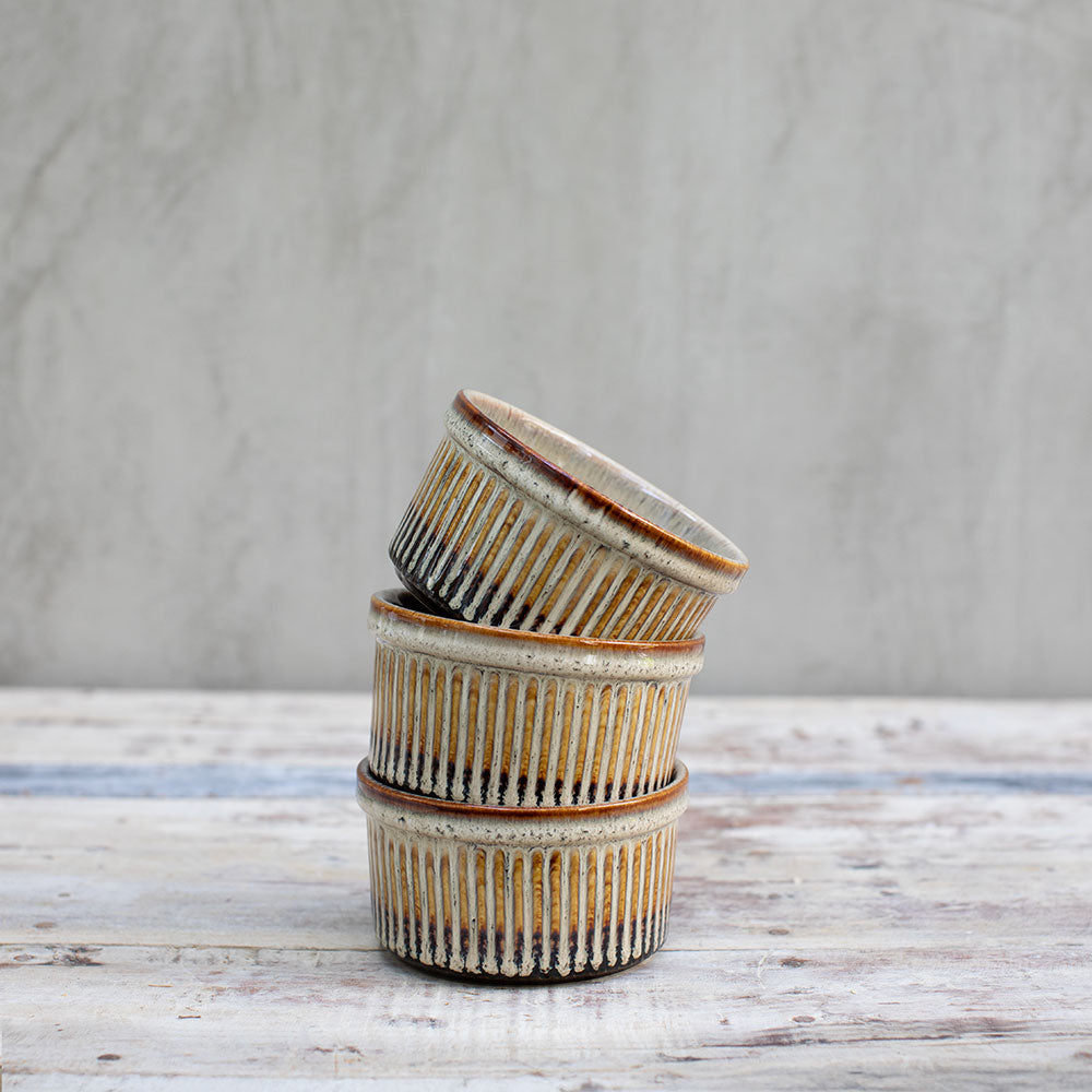 Ramekín de cerámica con esmalte reactivo y textura acanalada. Tonos tierra que varían pieza a pieza, para una mesa cálida y con carácter.