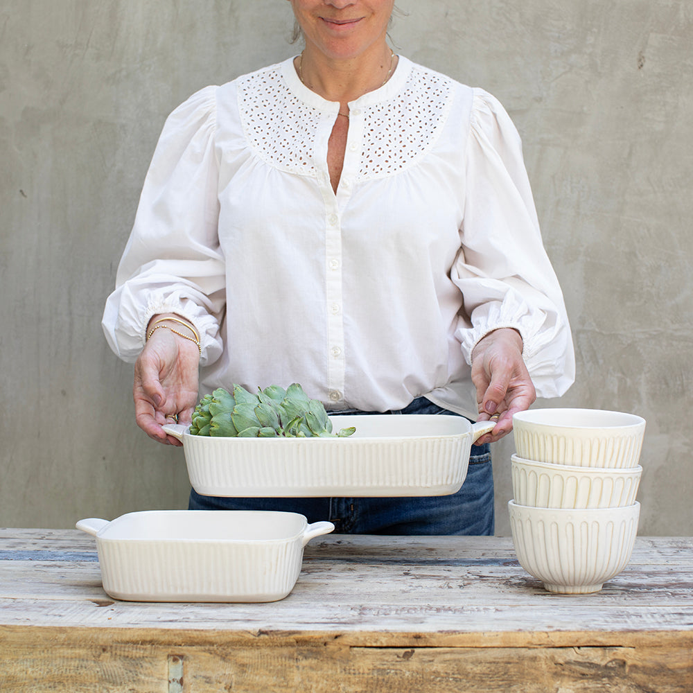 Bowl multiuso para salsas, mezcla de dips, fruta trozada o acompañamientos que quieres llevar del horno a la mesa (gratín suave). El esmaltado blanco rústico combina con madera, lino y piezas color.