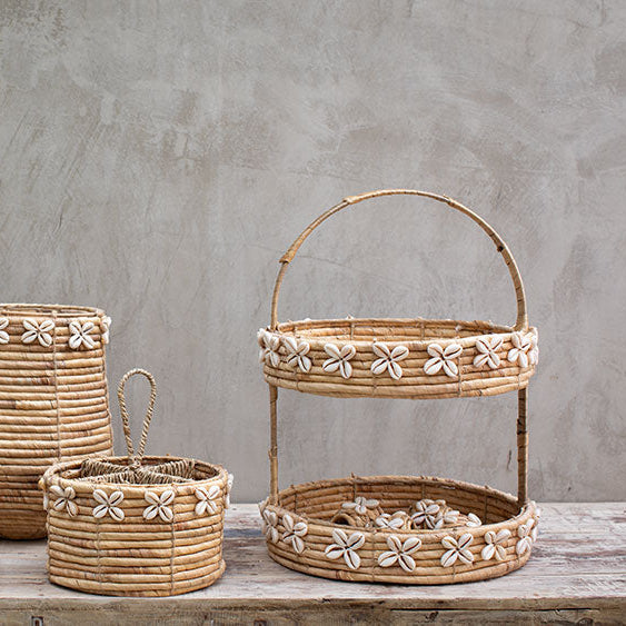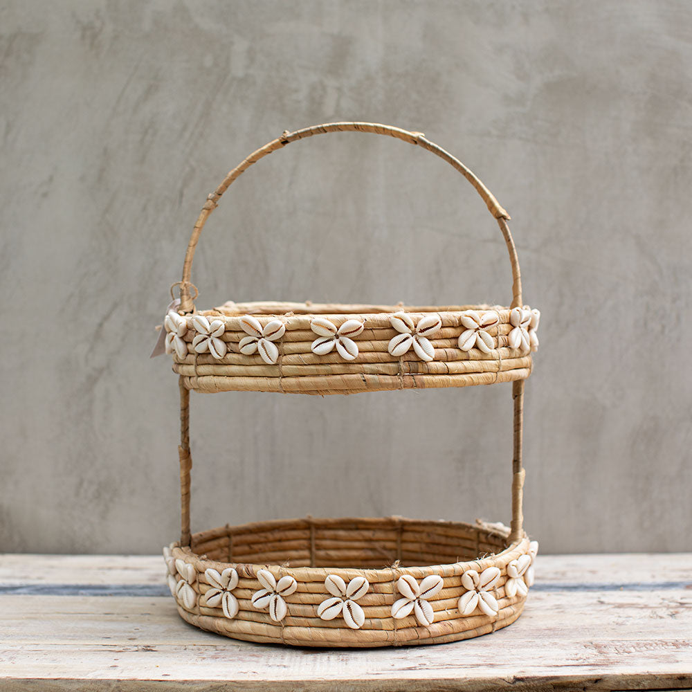 Canasto dos pisos tejido a mano en hyacinth (jacinto de agua) y adornado con flores de conchas naturales. Liviano y firme, con asa superior para moverlo fácil. Su textura cálida y aire costero visten la mesa sin recargar—perfecto para el look simple y boho de Simple.