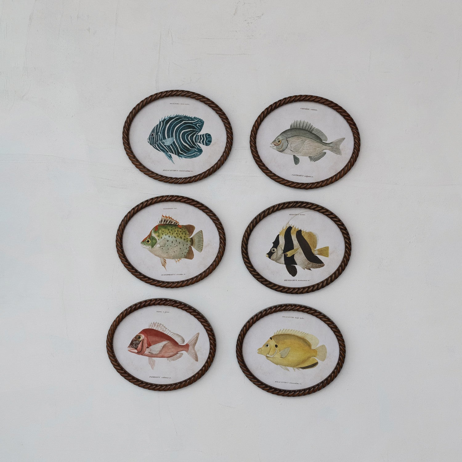 Un aire náutico y elegante 🐠✨. Seis diseños de peces vintage enmarcados en óvalos con marco retorcido y vidrio protector.