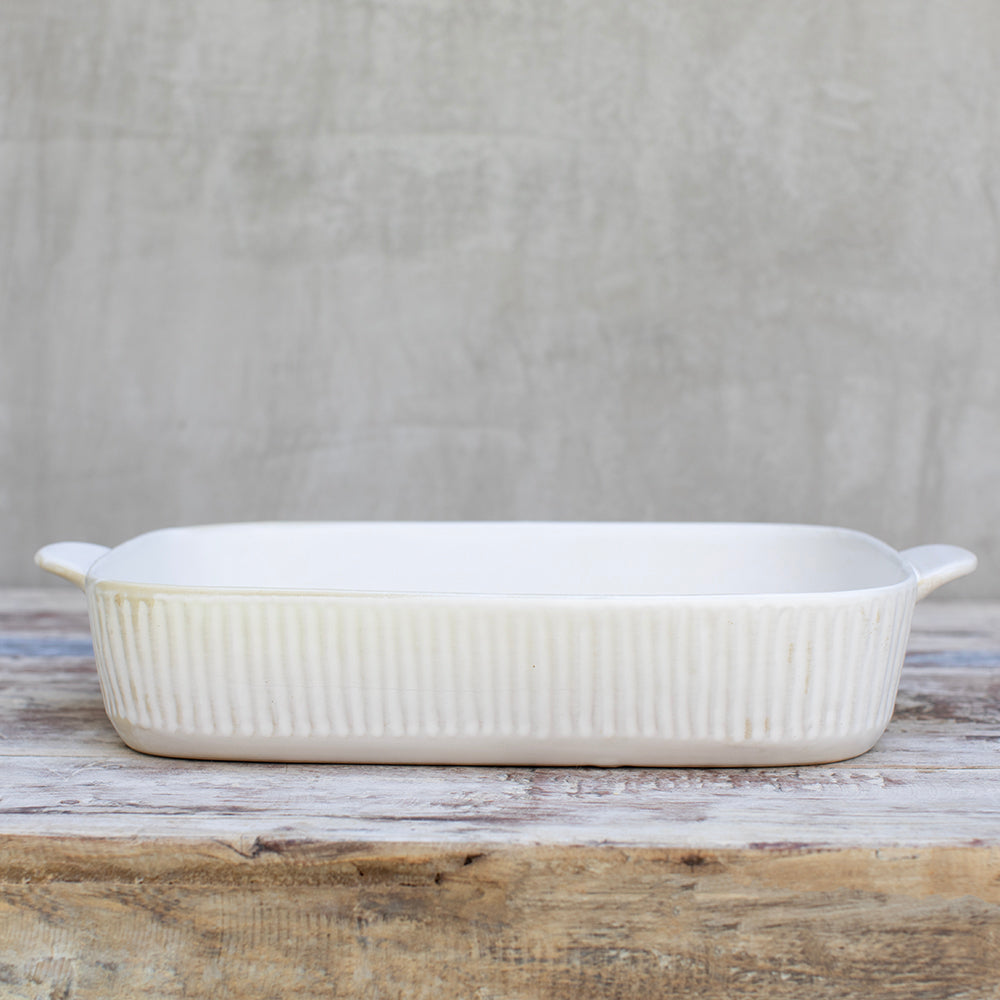 Fuente de cerámica reactive glaze para el horno y llevar directo a la mesa. Ideal para: lasañas familiares, verduras asadas, pollos o pescados al horno. Paredes altas para salsas generosas y transporte seguro del horno a la mesa.