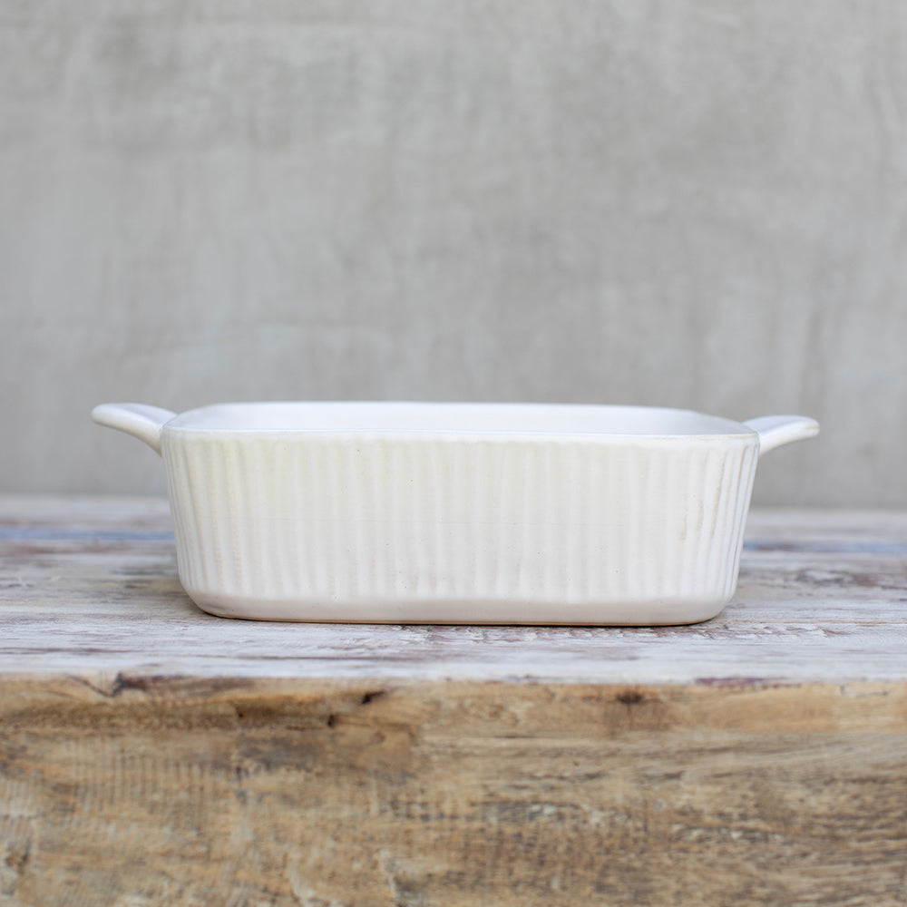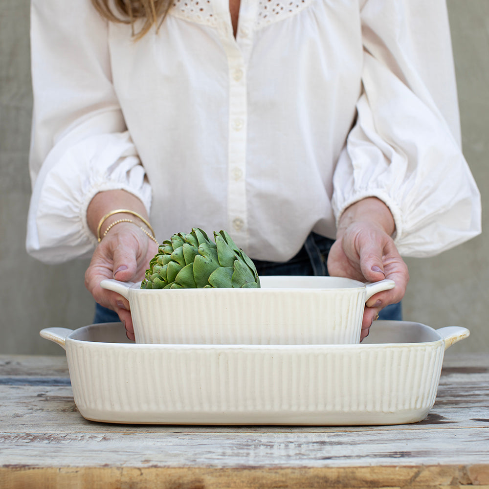 Fuente mediana reactive glaze ideal para gratines, canelones, verduras al horno o ensaladas de acompañamiento. Formato versátil para familias pequeñas o para complementar la fuente grande en eventos.