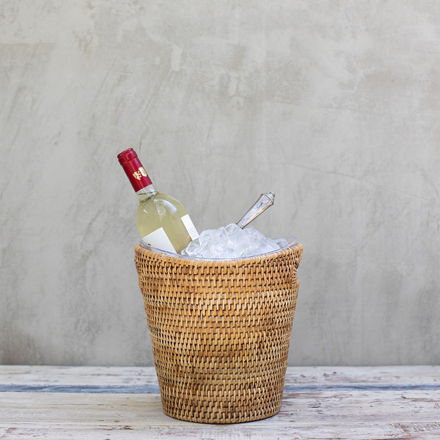 Perfecta para celebraciones especiales y encuentros al aire libre, esta hielera para champaña combina la belleza natural del ratán tejido a mano con la resistencia y limpieza de una base interior acrílica.