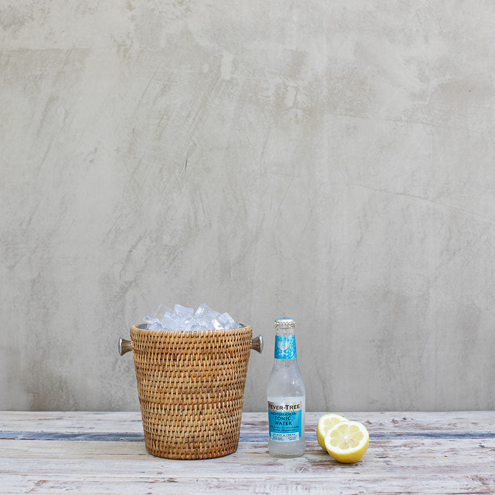 Eleva tu mesa y tus reuniones con esta hielera tejida a mano en ratán natural y detalles en acero inoxidable.