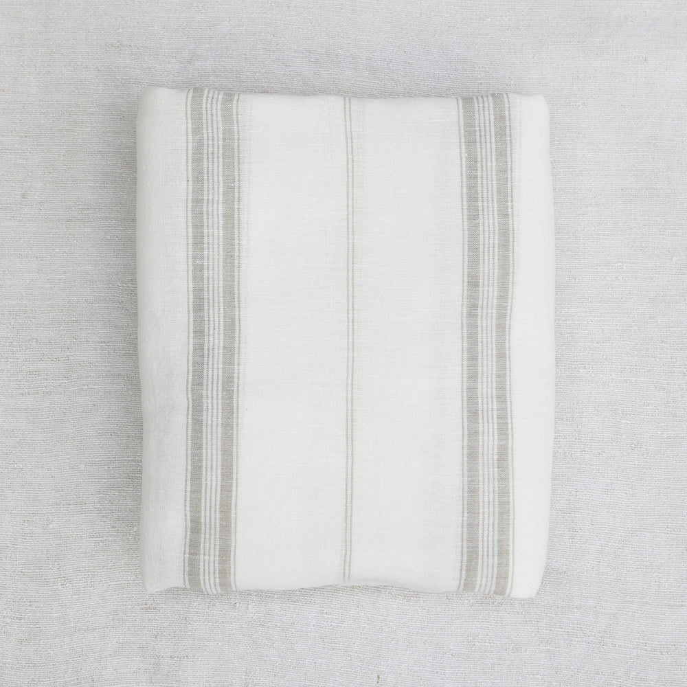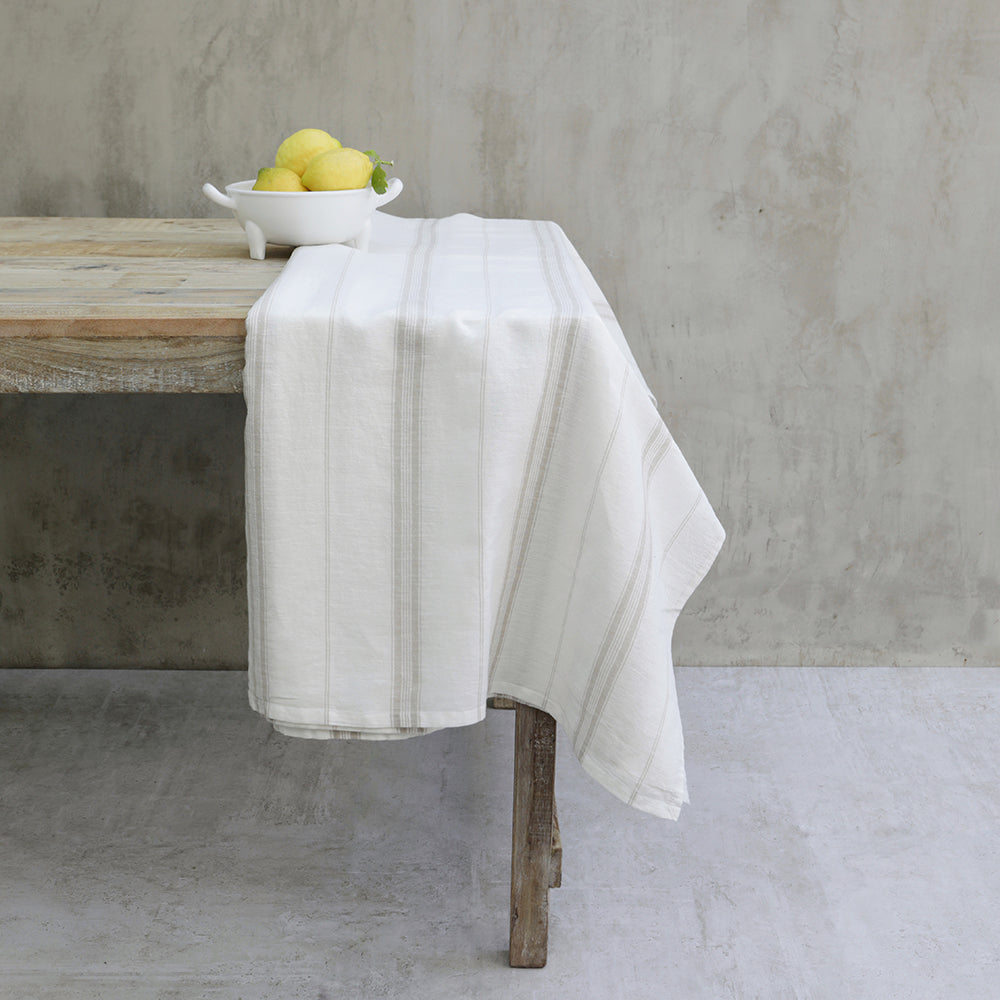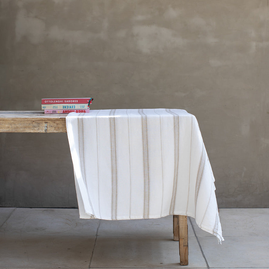 Mantel en mezcla de lino y algodón en tonos blanco y beige, ideal para crear una mesa elegante, cálida y natural.