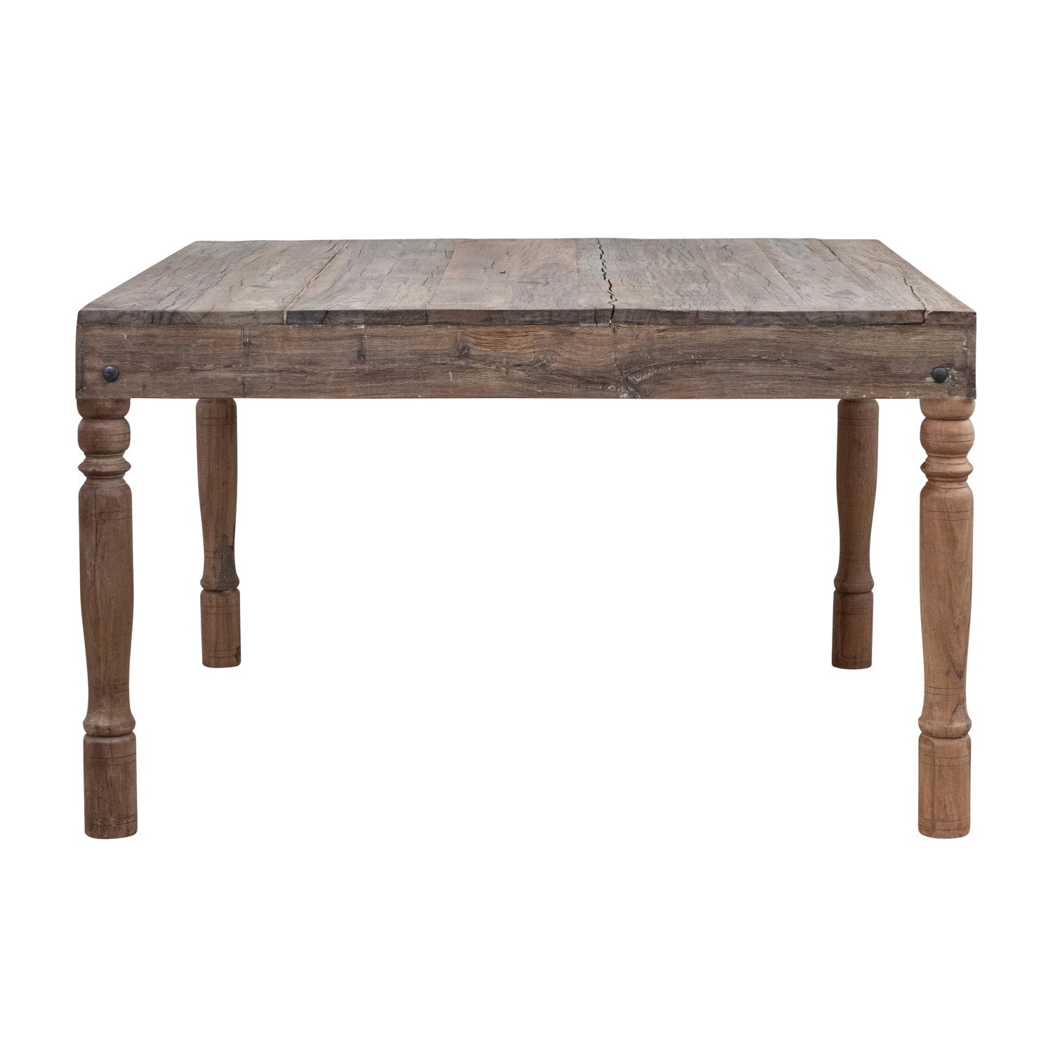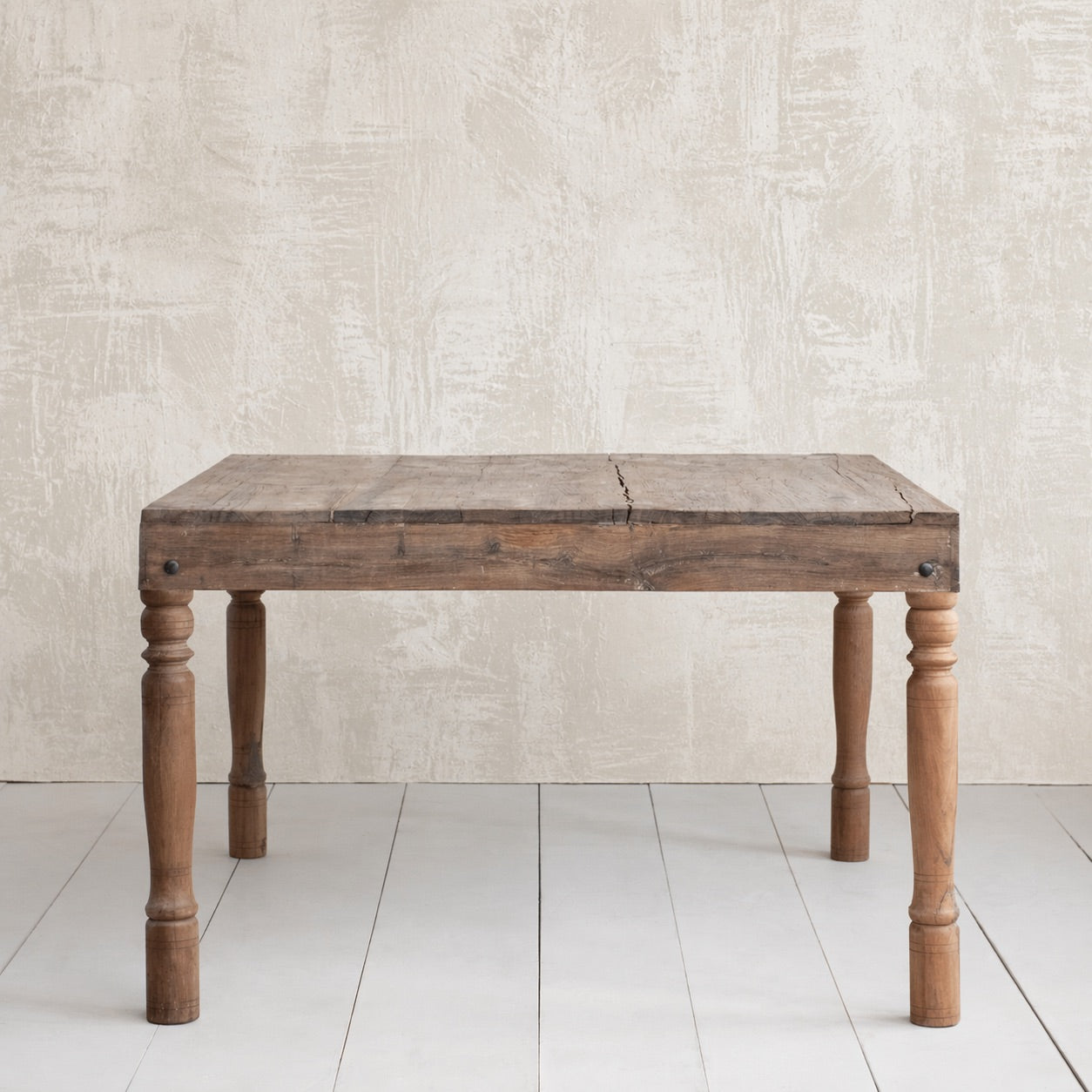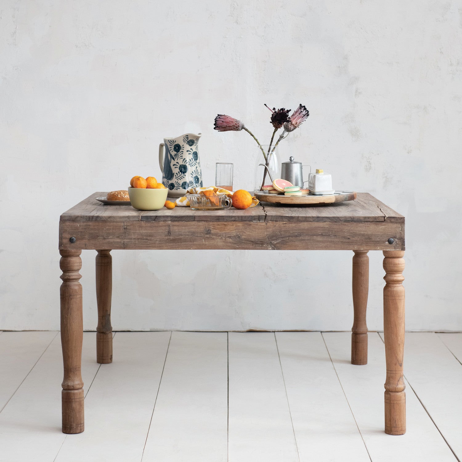 Mesa de comedor de madera recuperada con patas torneadas y acabado natural, diseño rústico y artesanal ideal para espacios cálidos, sostenibles y con estilo atemporal.