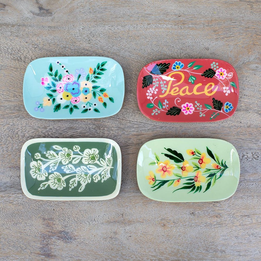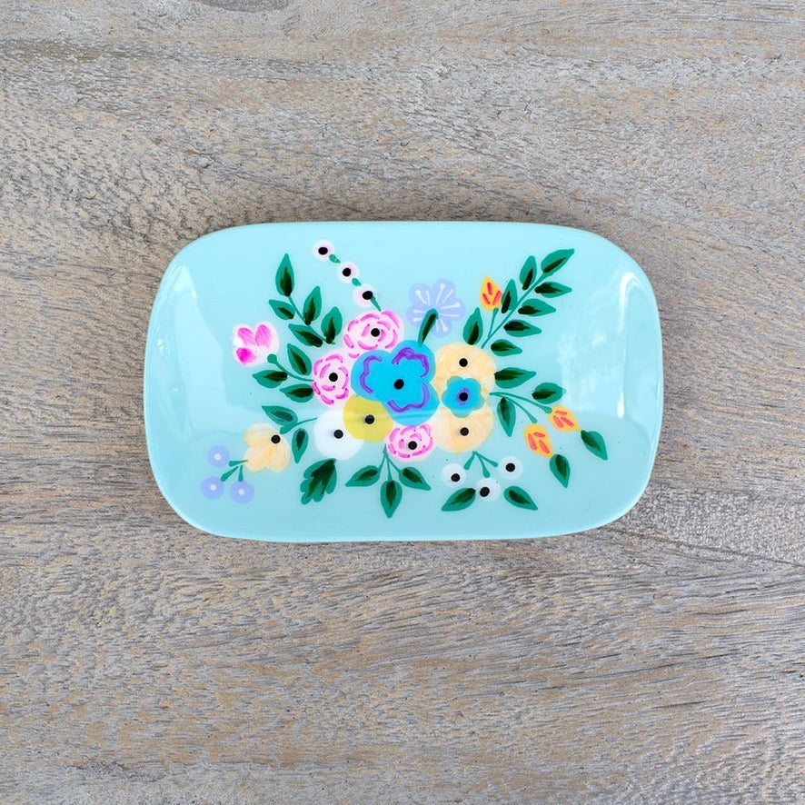 Una pequeña obra de arte que combina artesanía y funcionalidad. Hecha en madera de mango natural, esta mini bandeja rectangular presenta un alegre diseño floral picture print con recubrimiento brillante apto para alimentos (food safe coating).