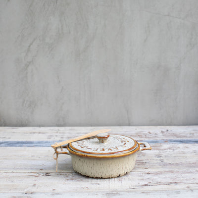 Pequeña cacerola de cerámica con tapa, perfecta para llevar del horno a la mesa con estilo. Su esmalte reactivo en tonos tierra (marrón/avellana) crea variaciones únicas pieza a pieza. Incluye un mini cuchillo de bambú ideal para untar y servir.