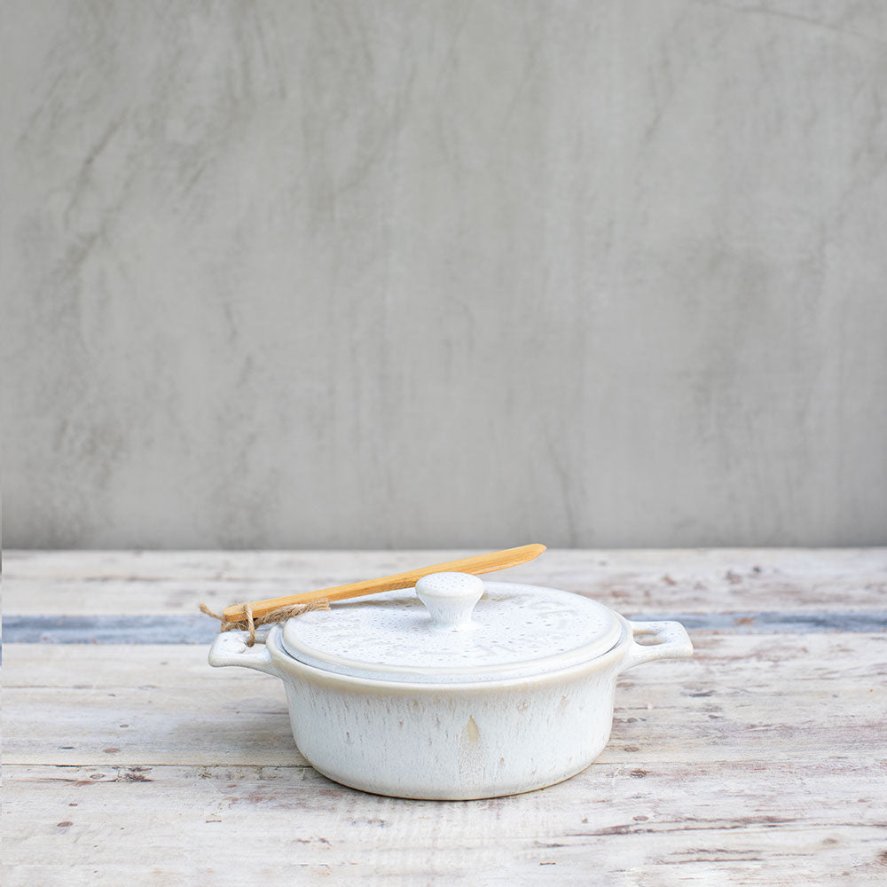Pequeña cacerola de cerámica con tapa, perfecta para llevar del horno a la mesa con estilo. Su esmalte reactivo en tonos blancos (marrón/avellana) crea variaciones únicas pieza a pieza. Incluye un mini cuchillo de bambú ideal para untar y servir.