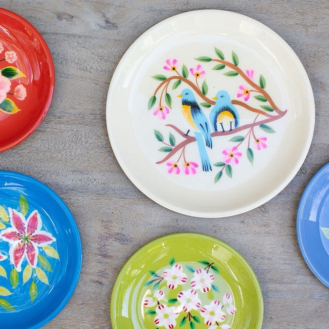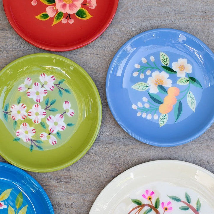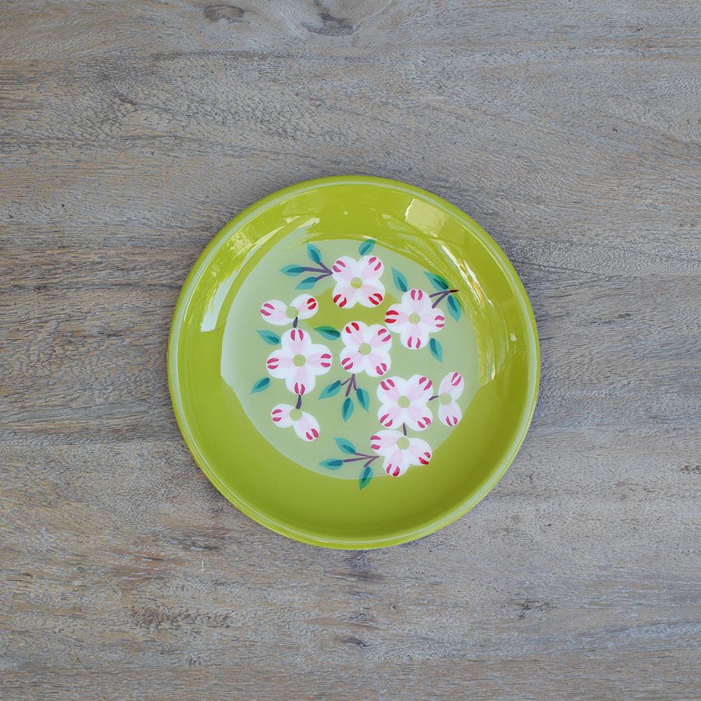 Este plato artesanal combina la durabilidad del acero inoxidable con la belleza de un diseño pintado a mano sobre un fondo verde suave. Cada flor ha sido cuidadosamente trazada, creando una pieza única, alegre y llena de vida.