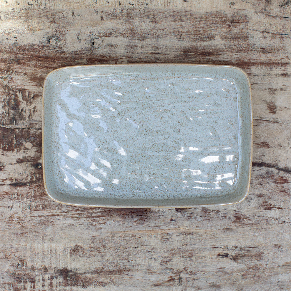 Bandeja de cerámica gris. Úsalo como bandeja para los salseros o para entradas, acompañamientos, postres con salsa o panera. Tiene un pequeño de borde para sostener los salseros y para que no se salga el jugo de preparaciones.