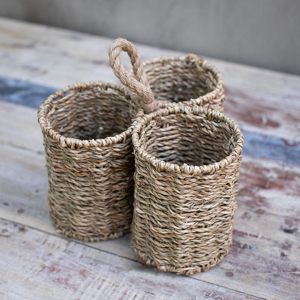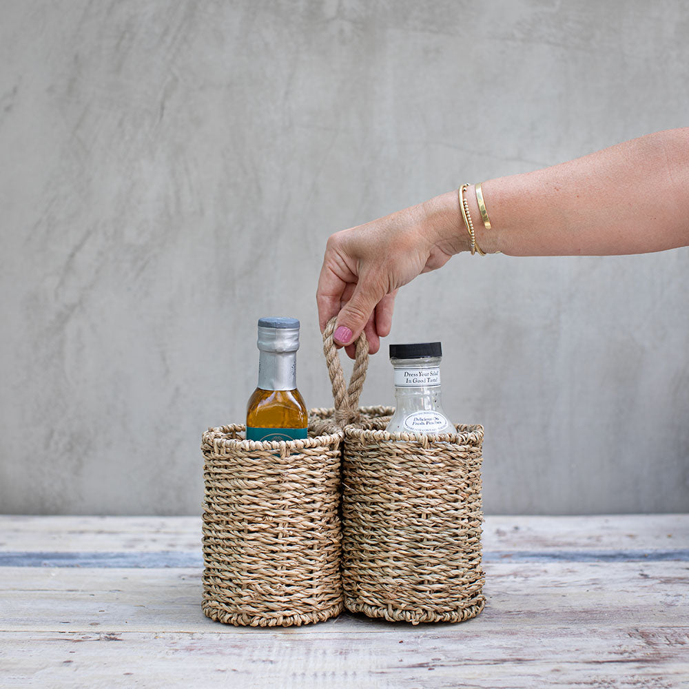 Caddy de tres cilindros tejido a mano en seagrass natural, con asa trenzada para llevarlo fácil de la cocina a la mesa o al quincho. Es firme, liviano y aporta esa textura cálida que amamos en Simple. Mantiene todo reunido y bonito en un solo lugar.