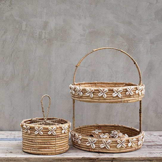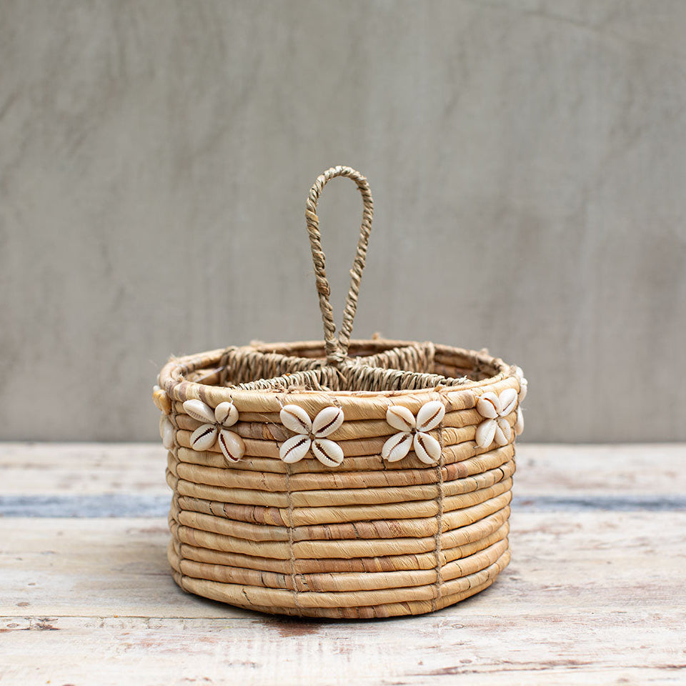 Cesto redondo tejido a mano en hyacinth (jacinto de agua), adornado con flores de conchas naturales. Tiene asa central para moverlo fácil y separadores internos que mantienen todo en su lugar. Textura cálida y aire costero para una mesa simple y linda.