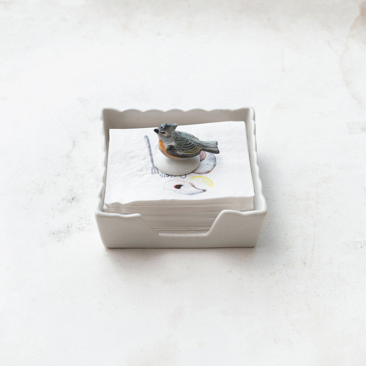 Añade encanto y funcionalidad a tu mesa con este servilletero de gres esmaltado. Su diseño rectangular con borde festoneado resalta por el detalle del pájaro decorativo en el centro, que además actúa como peso para mantener las servilletas en su lugar.