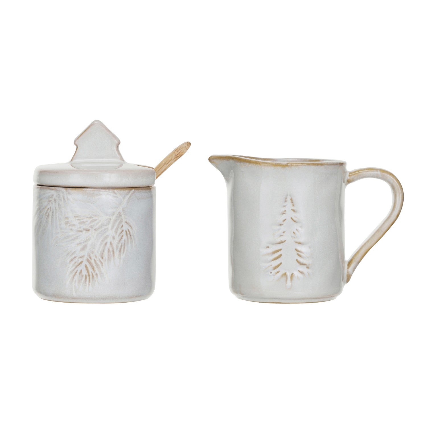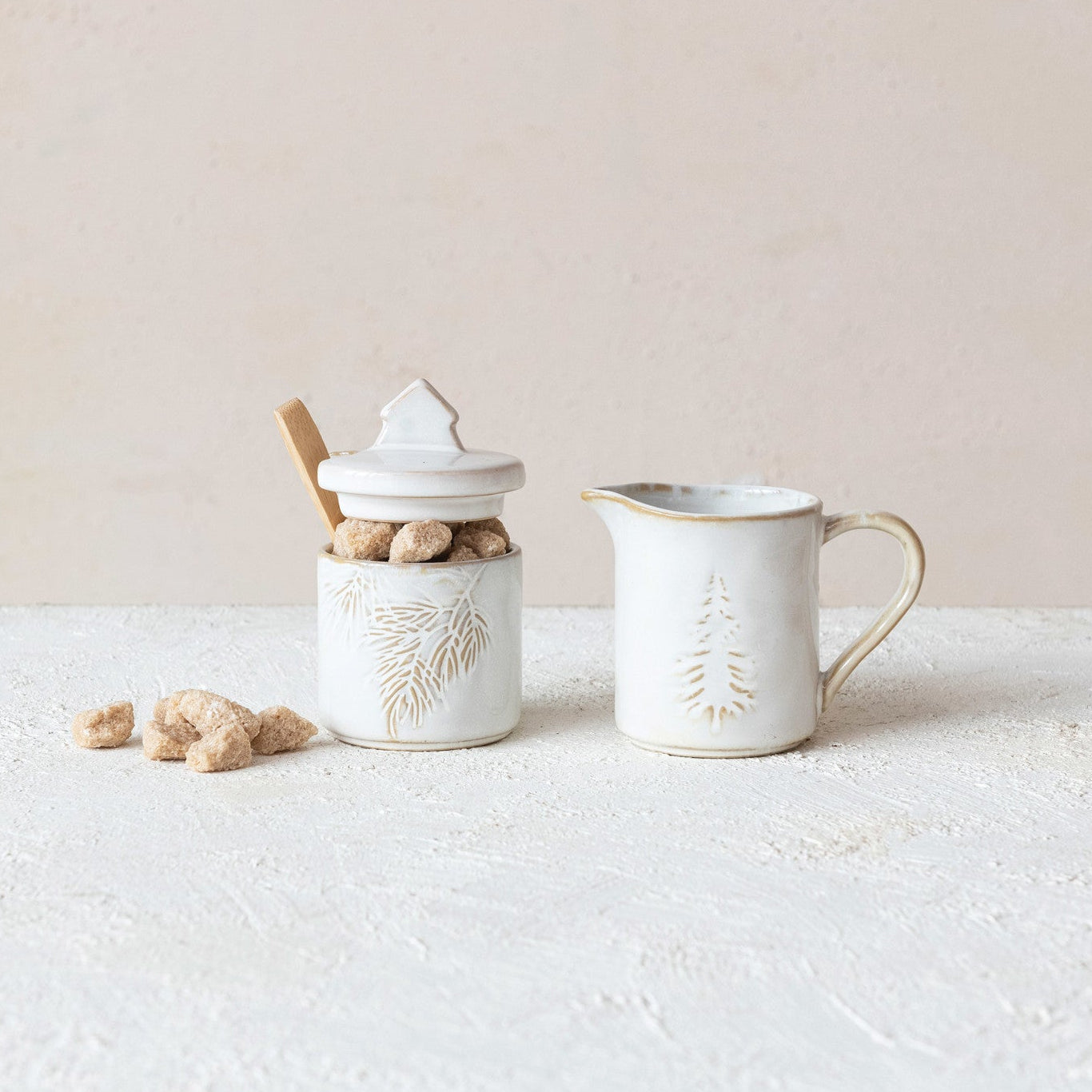Este set de mesa es una pieza especial para acompañar tus momentos cálidos en casa. Hecho de stoneware con acabado reactivo en tono blanco suave y delicado envejecido, incluye una azucarera con tapa, una lechera, y una cucharita de madera natural. Cada pieza tiene un relieve de ramas y pinos, que aporta una estética orgánica, artesanal y atemporal.
