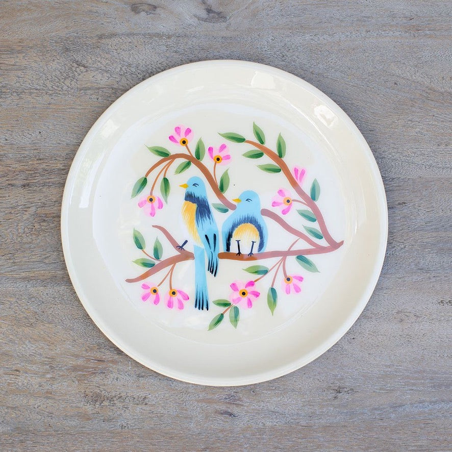 Este hermoso plato está elaborado en acero inoxidable y pintado completamente a mano, combinando tradición artesanal con un estilo fresco y alegre. Su diseño presenta dos aves sobre ramas floridas, en tonos vibrantes que aportan vida a cualquier espacio.
