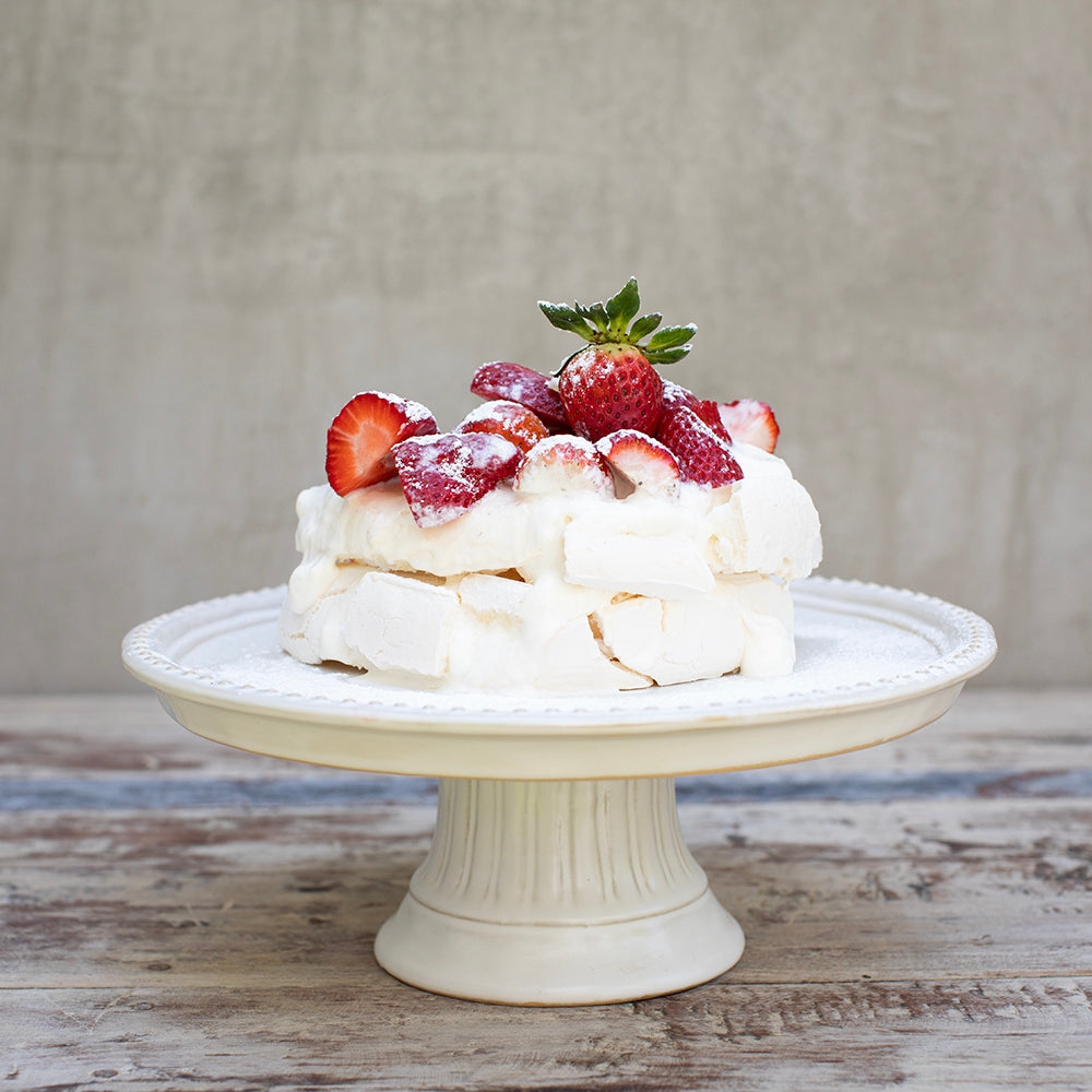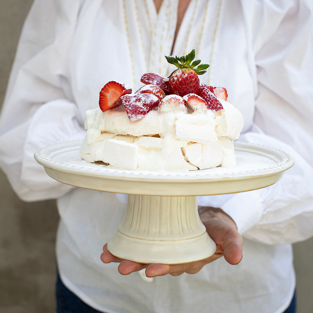 Tortero de cerámica reactive glaze blanco para servir tortas, pies, cheesecakes y tartas. La base elevada brinda altura a la mesa, ideal para mesas dulces o brunch. También para quesos y frutas a modo de pedestal.